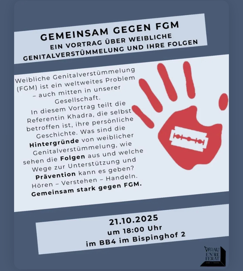 Weibliche Genitalverstümmelung (FGM) ist ein weltweites Problem – auch mitten in unserer Gesellschaft. In diesem Vortrag am 21.10. um 18 Uhr teilt die Referentin Khadra, die selbst betroffen ist, ihre persönliche Geschichte. Was sind die Hintergründe von weiblicher Genitalverstümmelung? Wie sehen die Folgen aus? und welche Wege zur Unterstützung und Prävention kann es geben?