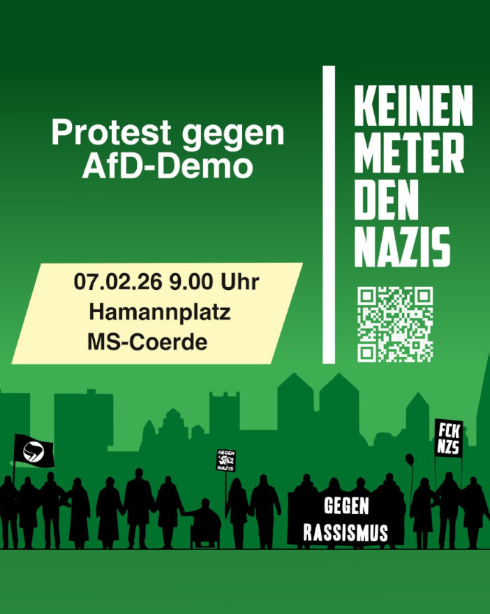 Das Bündnis „Keinen Meter den Nazis“ aus Münster kündigt Proteste gemeinsam mit der Initiative Coerde ist bunt gegen eine Kundgebung der extrem rechten AfD am 7. Februar 2026 in Münster-Coerde an.