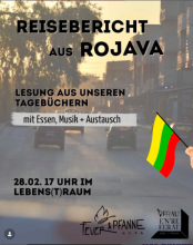 Es wird aus den Tagebüchern vorgelesen und Fotos gezeigt. Zusammen mit dem Kochkollektiv "Feuer und Pfanne" wird ein Essen gekocht, was sie dort kennen gelernt haben. Bei Essen und in gemeinschaftlicher Runde, wird es auch Musik geben und die Möglichkeit für Austausch und Diskussion, bei der wir auch gerne auf die aktuelle Lage in Rojava eingehen möchten. Wir freuen uns auf alle, die kommen möchten, egal ob ihr euch schon lange mit Rojava auseinander setzt oder noch gar nicht so viel wisst, aber neugierig seid. Der Raum ist barrierefrei. Bringt auch gern eure Kinder mit.