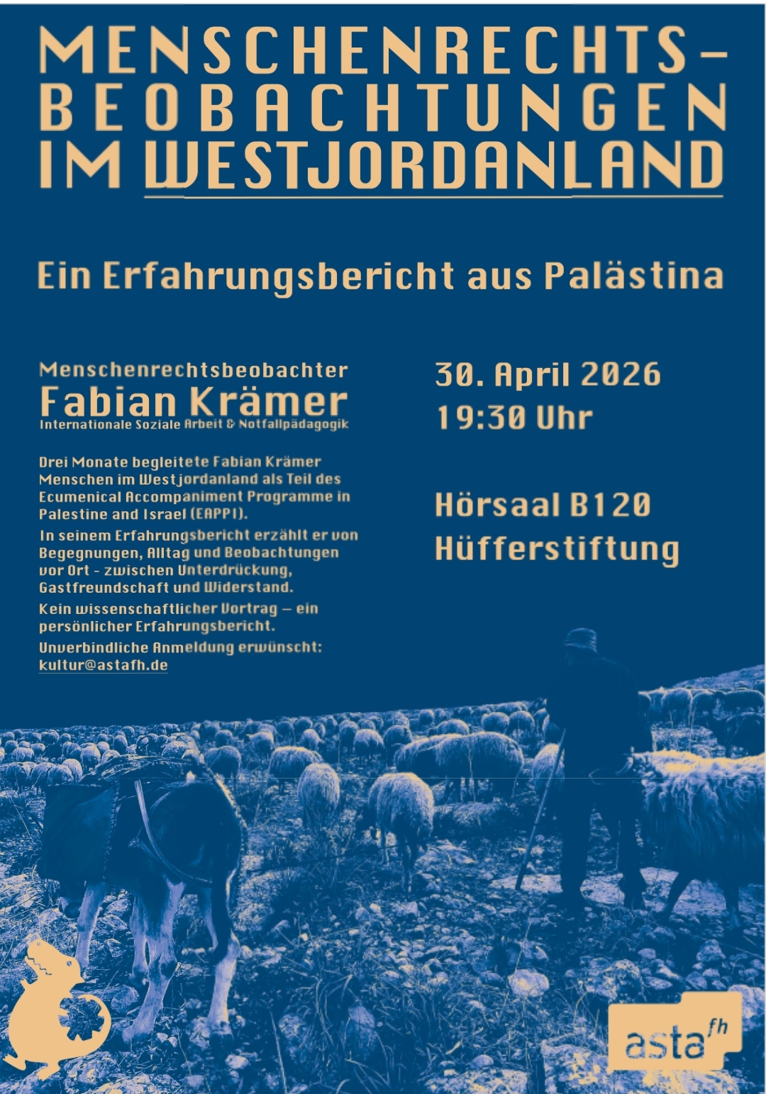 Fabian Krämer war über das „Ecumenical Accompaniment Programme in Palestine and Israel (EAPPI)“ als Menschenrechtsbeobachter im besetzten Westjordanland tätig. Drei Monate lang begleitete er Menschen, die unter den Bedingungen der militärischen Besatzung leben – und hörte Geschichten von Unterdrückung und Gewalt, aber auch von Gastfreundschaft, Mut und Standhaftigkeit.