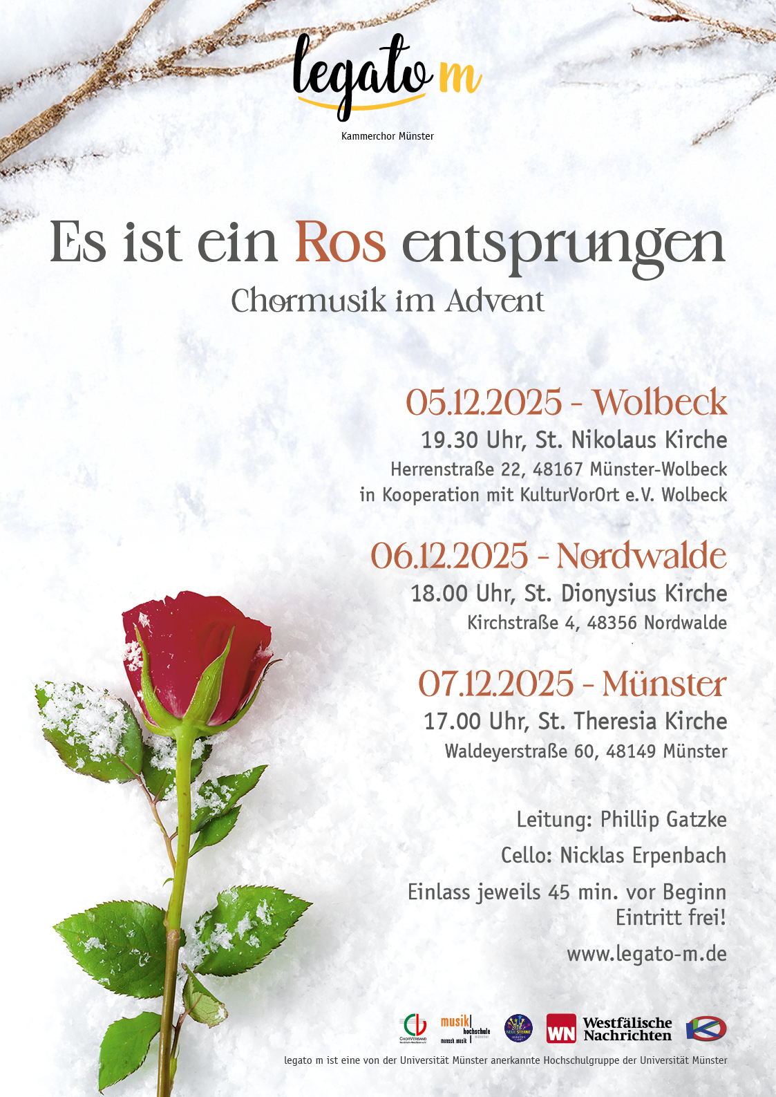 Der junge Kammerchor legato m lädt zu drei Adventskonzerten ein, in denen bekannte Melodien der Adventszeit in neuem Klanggewand erstrahlen. Im Mittelpunkt des Programms steht das kirchliche Adventslied „Es ist ein Ros entsprungen“ aus dem 16. Jahrhundert – präsentiert in facettenreichen Vertonungen von unter anderem Ola Gjeilo, Hugo Distler, Michael Praetorius und Alban Berg.