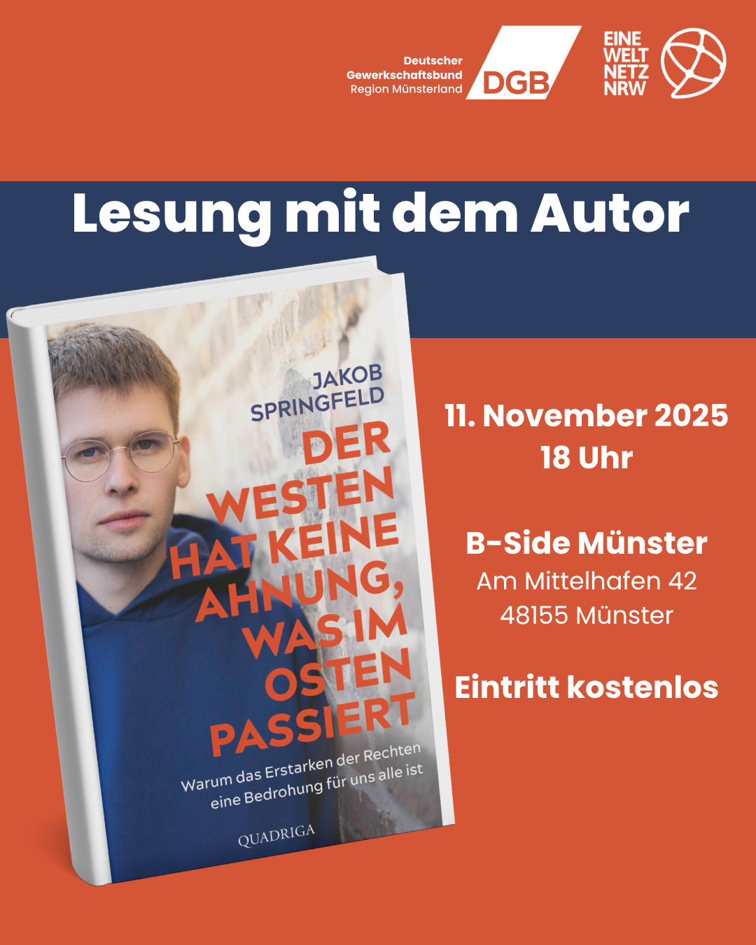 wir laden Euch herzlich zur Lesung mit dem Autor Jakob Springfeld am 11. November 2025 um 18 Uhr in der B-Side Münster (Am Mittelhafen 42) ein.