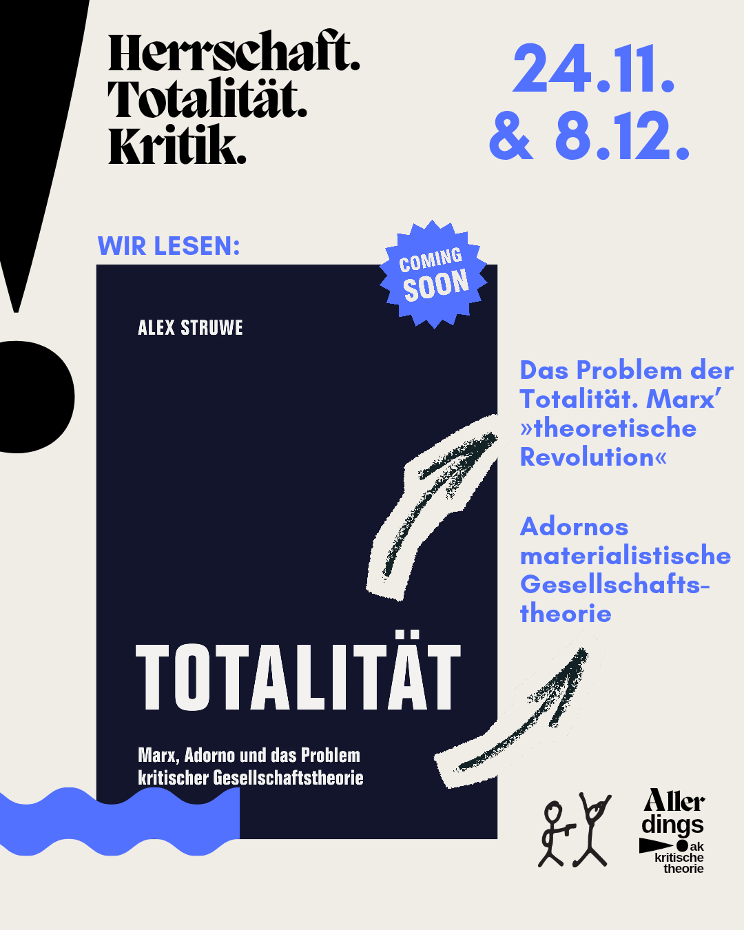 Am 24.11. und am 8.12. lesen wir aus dem Buch "Totalität" von Alex Struwe einige Abschnitte zu Marx und Adorno.