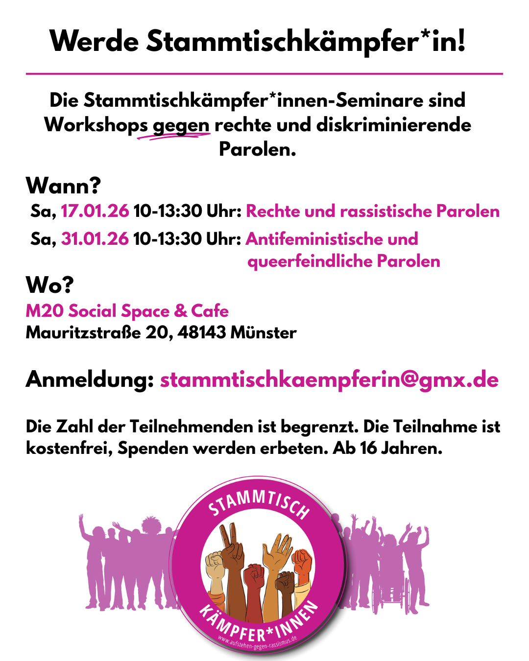 Wir alle kennen das: Auf der Arbeit, im Sportverein, in der Familie oder auf der Straße fallen Sprüche, die uns die Sprache verschlagen. Später ärgern wir uns, hätten gerne den Mund aufgemacht. Hier setzt dieser Workshop an. Er soll Menschen in die Lage versetzen, die Schrecksekunde zu überwinden, Position zu beziehen und deutlich zu machen: Das nehmen wir nicht länger hin! In Theorie und Praxis werden gängige rechte Positionen untersucht und es wird geübt, das Wort zu ergreifen und für solidarische Alternativen zu streiten statt für Ausgrenzung und Rassismus.