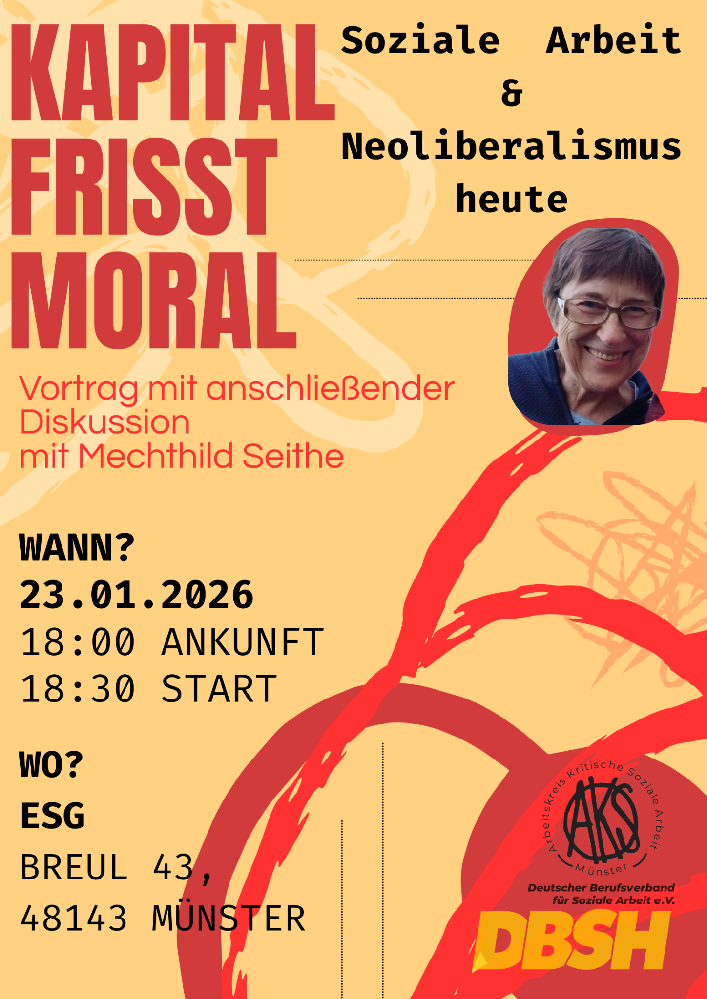 Die Praktikerin, Autorin und Dozentin Soziale Arbeit, Mechthild Seithe, wird uns diese und weitere Analysen in einem Vortrag über ihr neuestes Buch vorstellen. Ihre Arbeit zeigt: Eine kritische Soziale Arbeit lehnt sich gegen diese stille Verwertungslogik auf. Gemeinsam wollen wir anschließend in einer Fishbowl-Diskussion darüber ins Gespräch kommen, wie ein widerstandsfähiger Einsatz für eine humanistische, fachliche und politische Soziale Arbeit aussehen kann und was wir dafür verändern müssen.