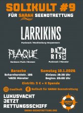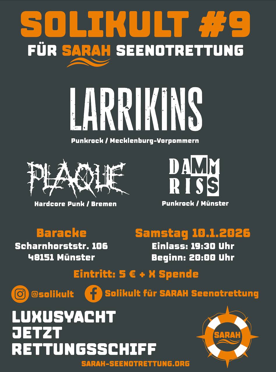Bald ist es wieder so weit. "Solikult für SARAH Seenotrettung" geht in die nächste Runde. Dieses Mal mit den Bands LARRIKINS, PLAQUE, DAMMRISS