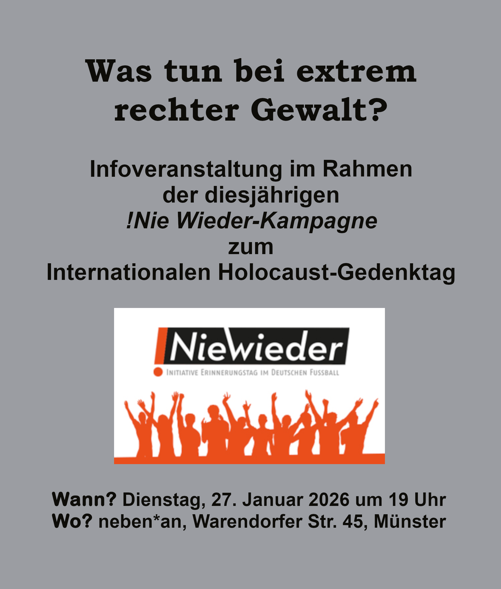 Am 27. Januar 2026 laden der FANport und BackUP ab 19:00 Uhr ins „neben*an“ (Warendorfer Str. 45, Münster) ein, um über dieses und andere Themen zu sprechen. Der Eintritt ist wie immer frei, eine Anmeldung nicht notwendig.