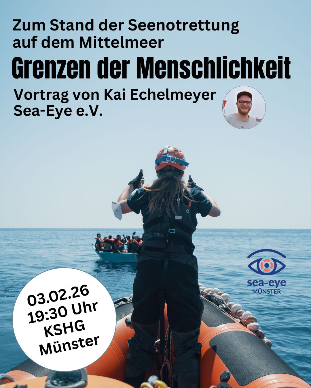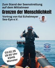In seinem Vortrag in Münster berichtet Kai Echelmeyer, erfahrener Seenotretter und Vorstandsmitglied von Sea-Eye, von seinem letzten Einsatz auf der SEA-EYE 5. Die Crew konnte 57 Menschen aus einem überfüllten Holzboot retten, in das bereits seit Stunden Wasser eindrang. Anhand von aufbereitetem Bildmaterial gibt er einen persönlichen und eindrücklichen Einblick in einen konkreten Rettungseinsatz auf dem Mittelmeer.