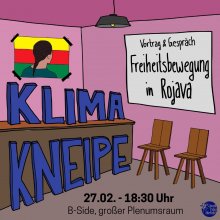 In der nächsten Klimakneipe geben uns zwei kurdische Gäst*innen einen Einblick in die historischen Entwicklungen, die zum kurdischen Widerstand geführt haben. Dabei sprechen sie  über die ideologischen und inhaltlichen Grundlagen Rojavas und was mit dem politischen Leitkonzept des demokratischen Konföderalismus gemeint ist. Außerdem soll aktuelle Ereignisse und Entwicklungen in der Region gehen !